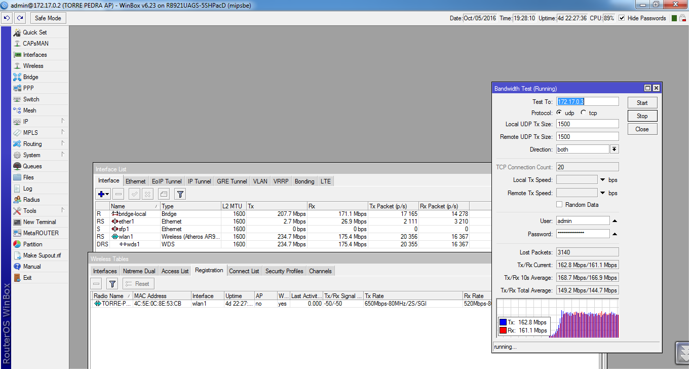 Essas rb922uags-5hpacd podem até prestar, mas nao pra mim. Estou indo no meu PTP voltar as velhas mas confiáveis APC5M18+; certo, não passam mais que 96megas, mas é preferivel 96 full do que 12, 13 falhados.