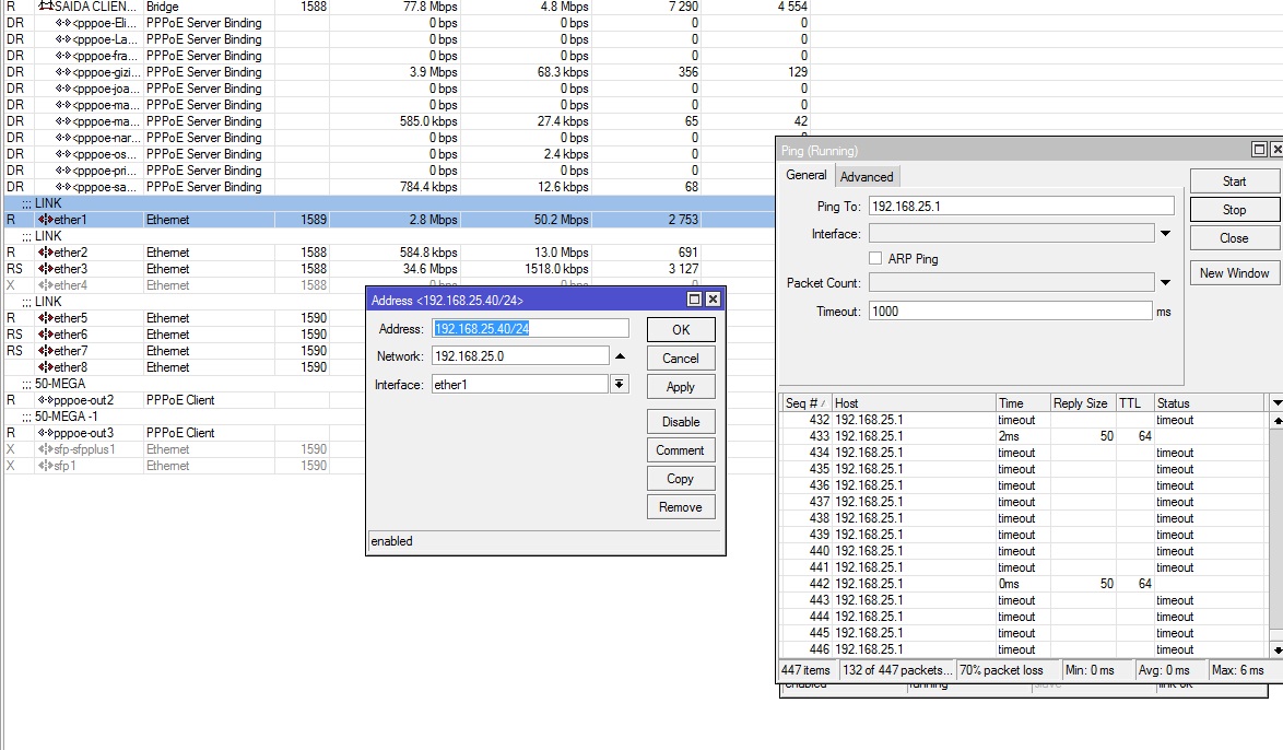 não consigo desbloqueá-lo, joguei esse moden na minha rb em modo router, em ip>adress coloquei um ip da faixa, começa a ter tráfego e ping normal, com questão de segundos, não consigo trafegar e o ping fica tendo perda, mudo para outro ip e continua da mesma forma conecta e com tempo tem perda, é como ele detectasse e bloqueia o ip!Anexo 65229