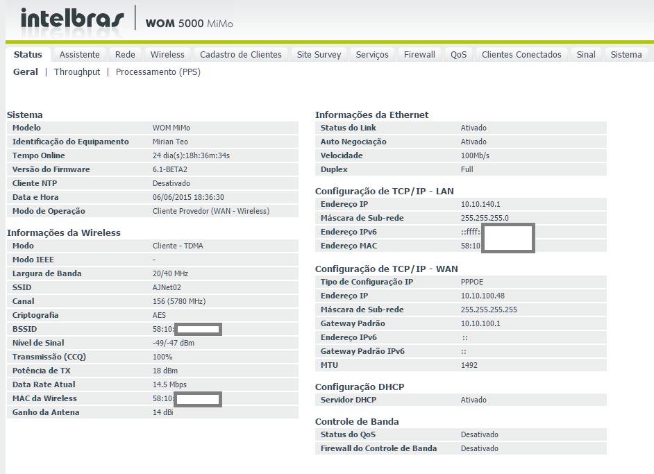 Bom gente, como se trata de um firmware beta e estamos testando para reportarmos os bugs, vou também relatar as inúmeras melhorias que encontrei nessa versão, depois de atualizar todos os equipamentos, minhas Bases não reiniciaram mais, a rede mudou completamente o desempenho ficando muito melhor e muito mais rápida com o Ipoll ativado, o único problema encontrado foi com o PPPoE, mais a equipe da Intelbras estão trabalhando e fazendo contato até a noite para pegar os arquivos de logs e encontra o mais rápido possível uma solução para o problema.