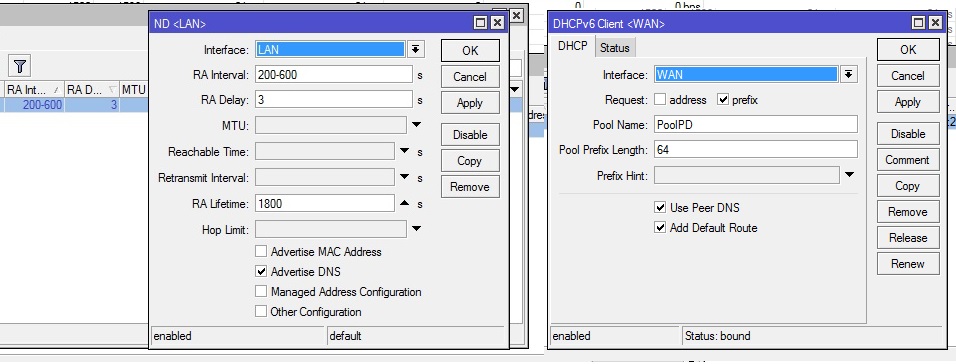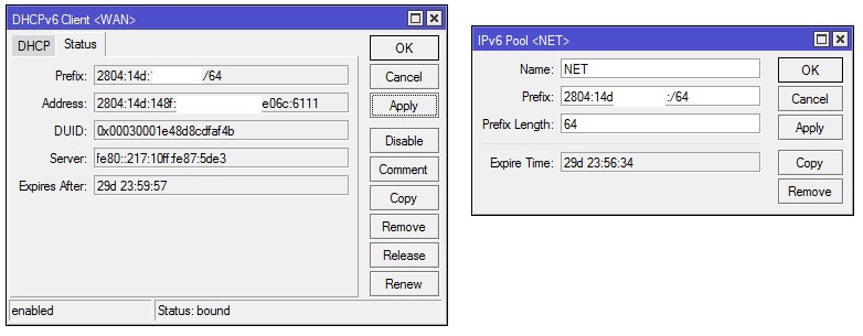 Em IPv6 "Dhcp Client" vc vai adicionar e selecionar a interface onde recebe do modem, setar apenas "prefix" por o nome do pool "PoolPD" e "Pool Prefix Length=64", setar "User Peer DNS" e setar "Add Default Route".