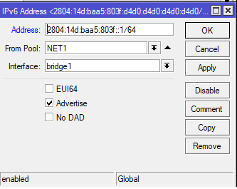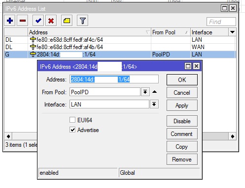 Em seguida vc vai em IPv6 address e adiciona "address=::1/64" "From Pool=PoolPD" "Interface=Sua_Interface_Da_Rede_Interna" e seta "advertise".