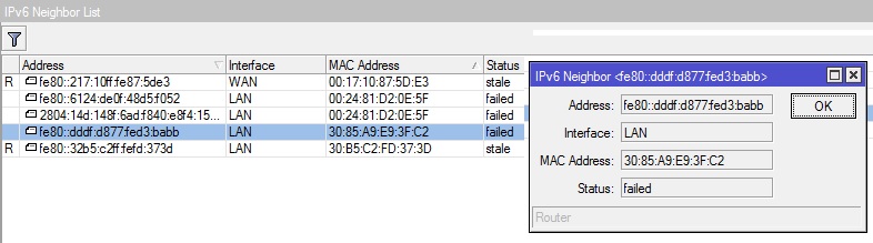 Agora que você falou sobre enxegar o MAC, fui em Neighbors e vi que o status fica alternando entre failed e stale. Esse aí é o MAC do PC que estou testando desde o início.