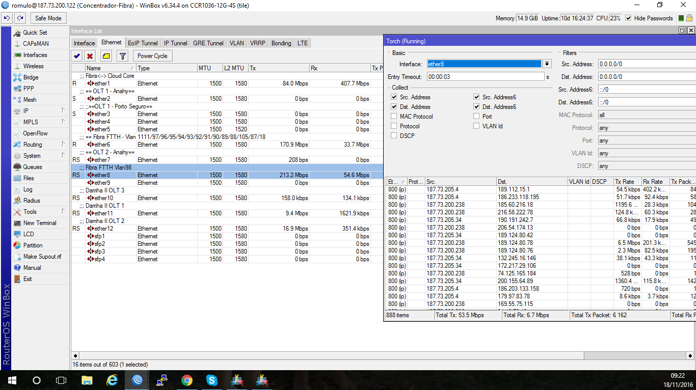 Estou passado com um problema com uma CCR 1036, onde o trafego que esta passando na interface é diferente do trafego de quando eu monitoro com "TORCH" a interface. Com essa diferença muito alta esta gerando problema de UPLOAD no cliente, o cliente esta autenticado via PPPoe e a queue sobe perfeita.