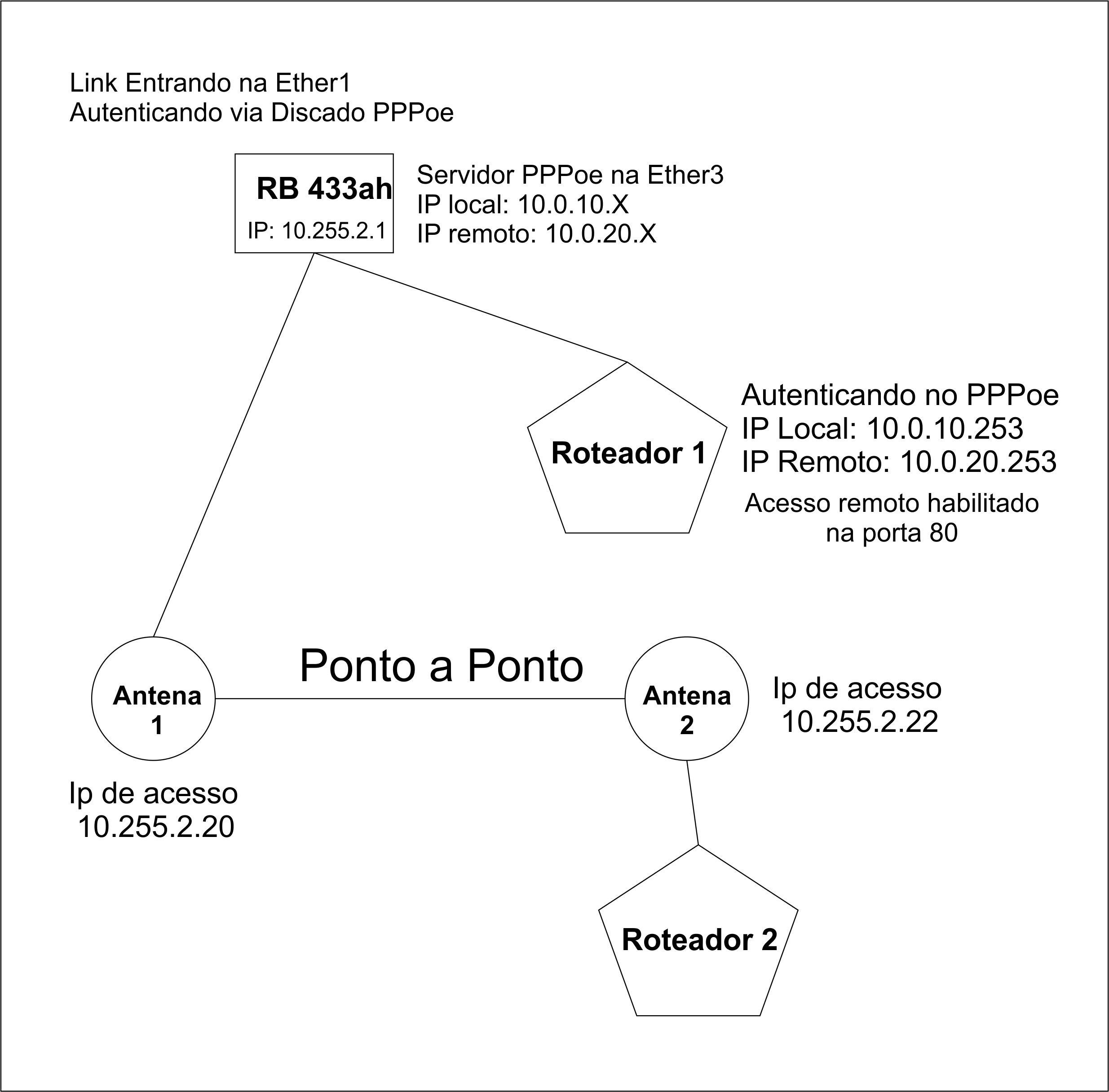 Tenho uma rb433ah recebendo um link na ether1 autenticado via discado pppoe, configurada com hotspot e pppoe na ether3. Ligados na ether3 tenho o meu roteador, um AP e um ponto-a-ponto com um roteador do outro lado. De qualquer local dentro da rede consigo acessar as duas antenas do ptp (antenas em bridge) através dos ip's delas (ip's: 10.255.2.20 e 10.255.2.22), os roteadores que estão autenticando no pppoe (usando o ip remoto: 10.0.20.X) e o bullet que faz AP em modo bridge (IP: 10.255.2.10). Como meu ip é dinâmico criei um ddns para ter acesso remoto, com ele consigo acessar a rb433ah e as antenas do ptp + o bullet através de redirecionamento de portas, mas não consigo acessar nenhum dos roteadores que estão autenticando no pppoe, tentei redirecionar do mesmo jeito que faço pra acessar as antenas mas não deu certo.