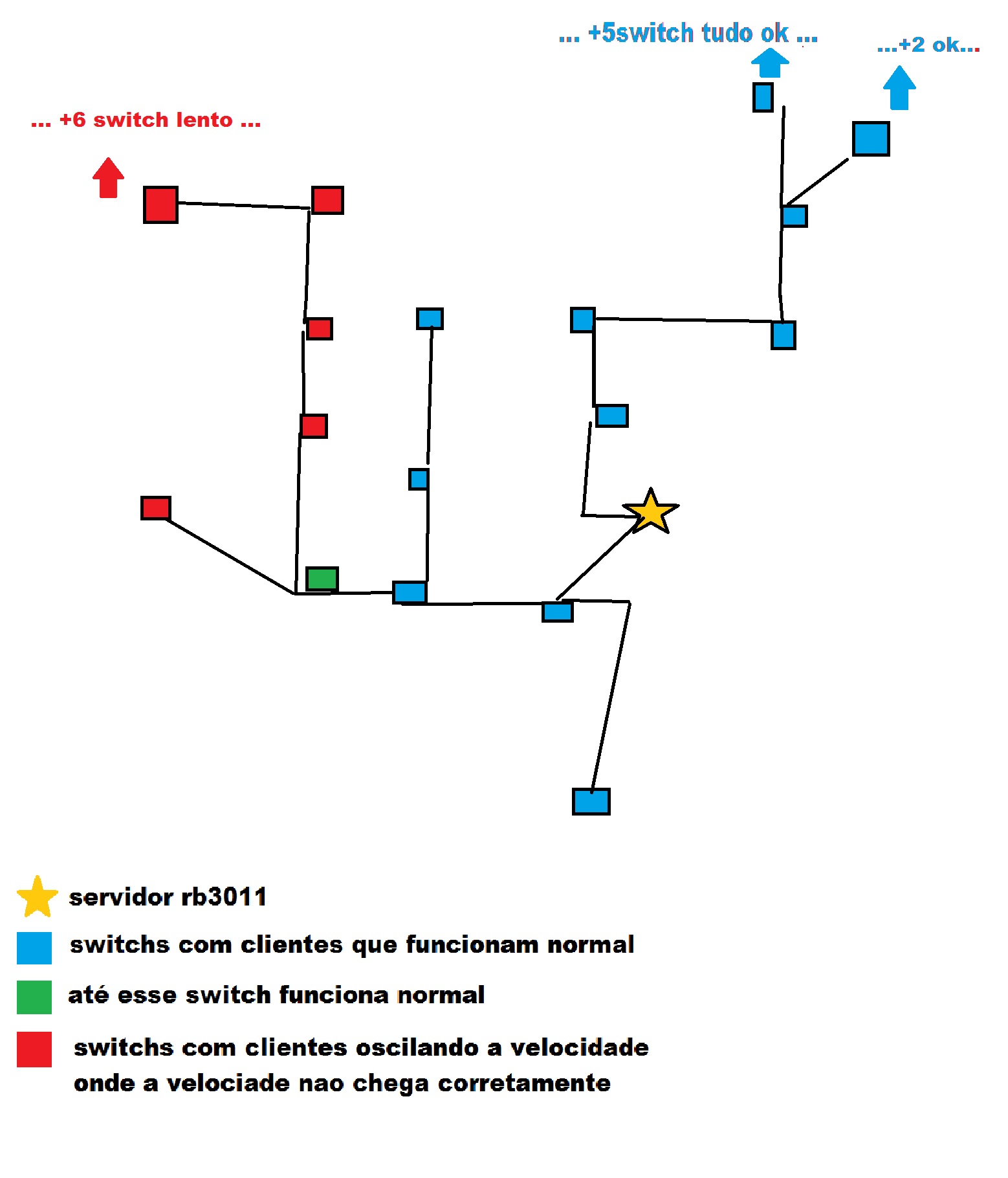 primeiramente boa noite, estou passando por um problema na minha rede onde a internet funciona normalmente até um determinado ponto uso uma 3011 como servidor pppoe e duas rotas de saída, em uma rota tenho cerca de 14 switch e na rota problemática 17 sendo que o problema começa depois do terceiro switch dessa segunda rota... na rota que está normal quando testo a velocidade no ultimo poste, consigo "sugar todo o link (cerca de 60mb) com o profile default (sem limite de banda)... na rota problemática onde os clientes estavam reclamando de lentidão, fui testando de poste em poste até chegar nesse, que fica oscilando muito de 5 a 20mb no máximo, o mais interessante é que não da perda de pacotes de jeito nenhum, troquei todo cabeamento e switchs da saída da RB até esse que apresenta o problema e ainda persiste essa oscilação na velocidade testei até sem nenhum cliente conectado pra evitar a hipótese de ser algum loop na rede, alguém tem alguma luz pra me dar?, já passaram por esse problema?