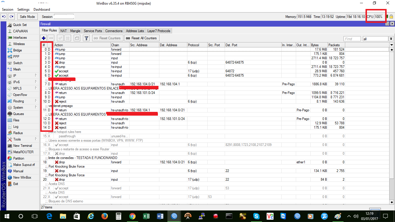 Faz o seguinte; acesa a rb vai em tools >> profile, lá vai mostrar o quanto cada item tá usando de recursos da rb verifica o quanto de processamento o firewall tá usando se tiver alto desativa tds as regras no firewall e deixa só o essencial pra funcionar e vai habilitando uma a uma e observa quando o processamento vai subir aí vc vai matar a charada.