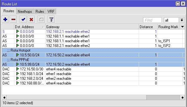 blz amigos,consegui fazer o seguinte,para a rede não parar por completo,criei um novo gateway na porta 5 do meu balance 172.16.501/30,e coloquei statico na rb do pppoe 172.16.50.2/30,fiz as rotas do balance para meu pppoe e hotspot,liberou a internet sem nat,será que fiz certo,precisa mais de alguma coisa.