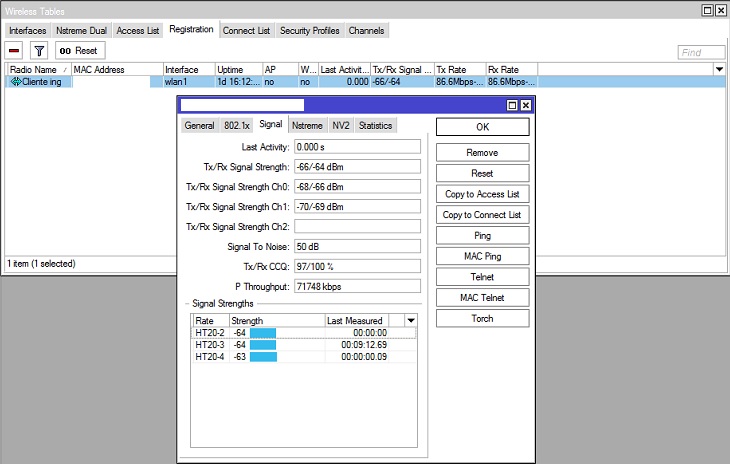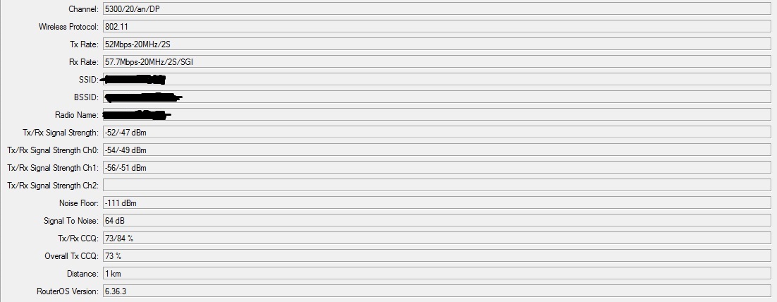 meus amigos, graças a vocês estou melhorando cada vez mais. afixei melhor uma das antenas que estavam folgadas, deixei bem firme e mudei algumas configurações como: aumentei a frequência de 5260 MHz para 5450 MHz, mudei de 40 MHz para 20 MHz e estou trabalhando com MCS mais alto agora, 10-11-12 ativos, resumindo, a conexão ficou super estável e estou conseguindo a taxa de transferência que eu preciso.... na imagem mostra como está o ccq agora, claro que ai está muito bom, mais o valor está oscilando entre os valores dessa imagem,