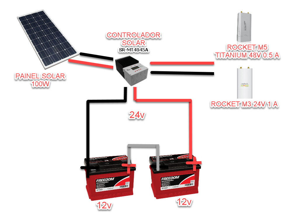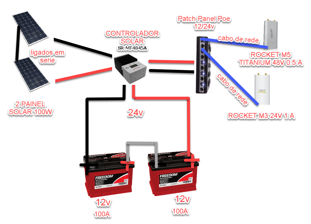 Atualmente na torre está instalado 1 Rocket M5 Titanium 48v 0.5A, e uma Rocket M3 24v 1A alimentado por um UPS DE 1200VA, que não suporta muito tempo, e na região que está instalado as vezes falta energia 3 dias seguidos. (Além de ser péssima quando funciona).