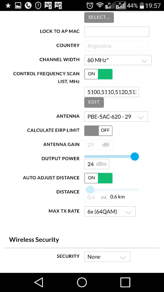 Este rádio tem o chip prismi ele nao opera corretamente fora das freguesias 5400 5800 ele nao tem uma boa performance fica instável com o enlace tente achar uma frequência dentes destes parâmetros e você vai ficar surpreso mais uma coisa ele nao gosta de passar muinto tráfego logo o processamento fica alto nao mais e pelos PPS acima de 7000 com banda de 80 MB chega a 100% isto em produção . Espero ter ajudado