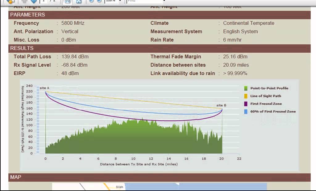 Usa o modo PTP do GoogleMaps. Preenche qualquer equipamento de 22dBi, sensibilidade tipo -86dBm, é mais pra ver se com a altura planejada das torres a zona de Fresnel (A linha azul no resultado do cálculo) passa longe do solo. Lembra que ele só tem o perfil do solo, ele não tem mapa de construções, então se a região tem casa a linha de fresnel de que passar pelo menos uns 7m acima do solo (Já que tem muita construção nessa altura), se for mato a linha precisa passar uns 10-15m acima do solo (Porque mato tem árvores de tamanhos variados conforme a região, se for amazônia tem árvore de 20m, a zona de Fresnel fica bem complicada com torre baixa).