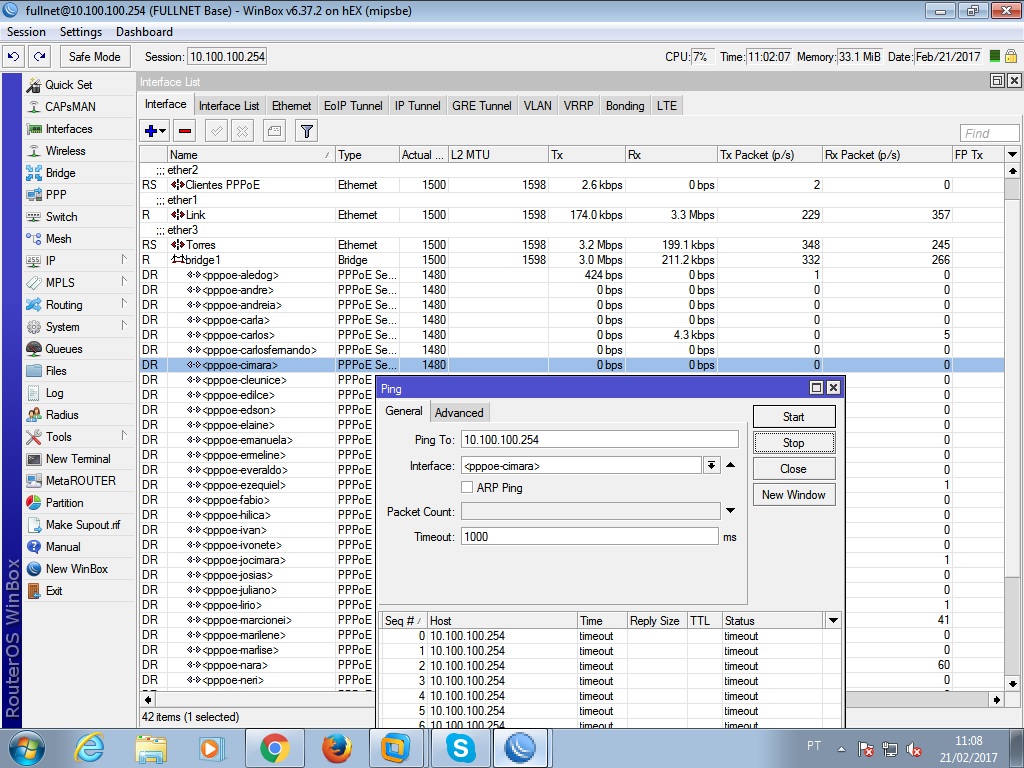 ja esta ativo os dois, mas ela ainda continua com a autenticaco feita so que sem navegar e sem ping ate no roteador dela, o jeito e trocar o fio mesmo