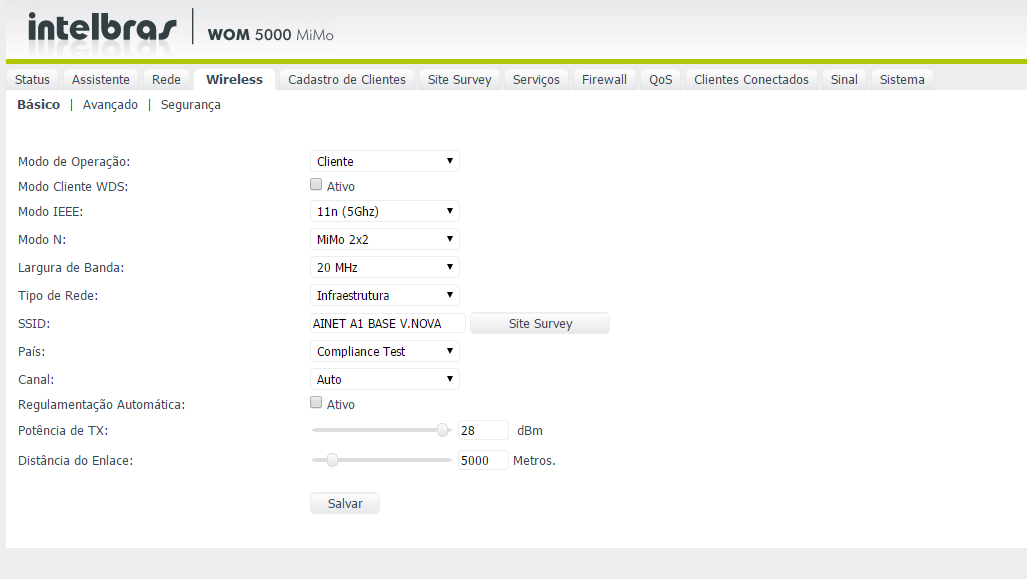 -A distância configurada neste cliente está correta, 5000 metros? Lembramos que este parâmetro deve ser configurado com 110% a 120% da distância real entre o cliente e a torre.