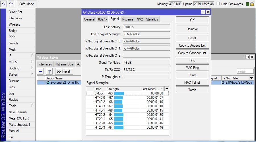 É comuns nuns locais com zona de Fresnel suja aparecer nesse caso sinal de -63dBm, quando na verdade uma das vias de comunicação está com -68dBm de sinal, que é um sinal ruim pro data rate e uso nesse exemplo.