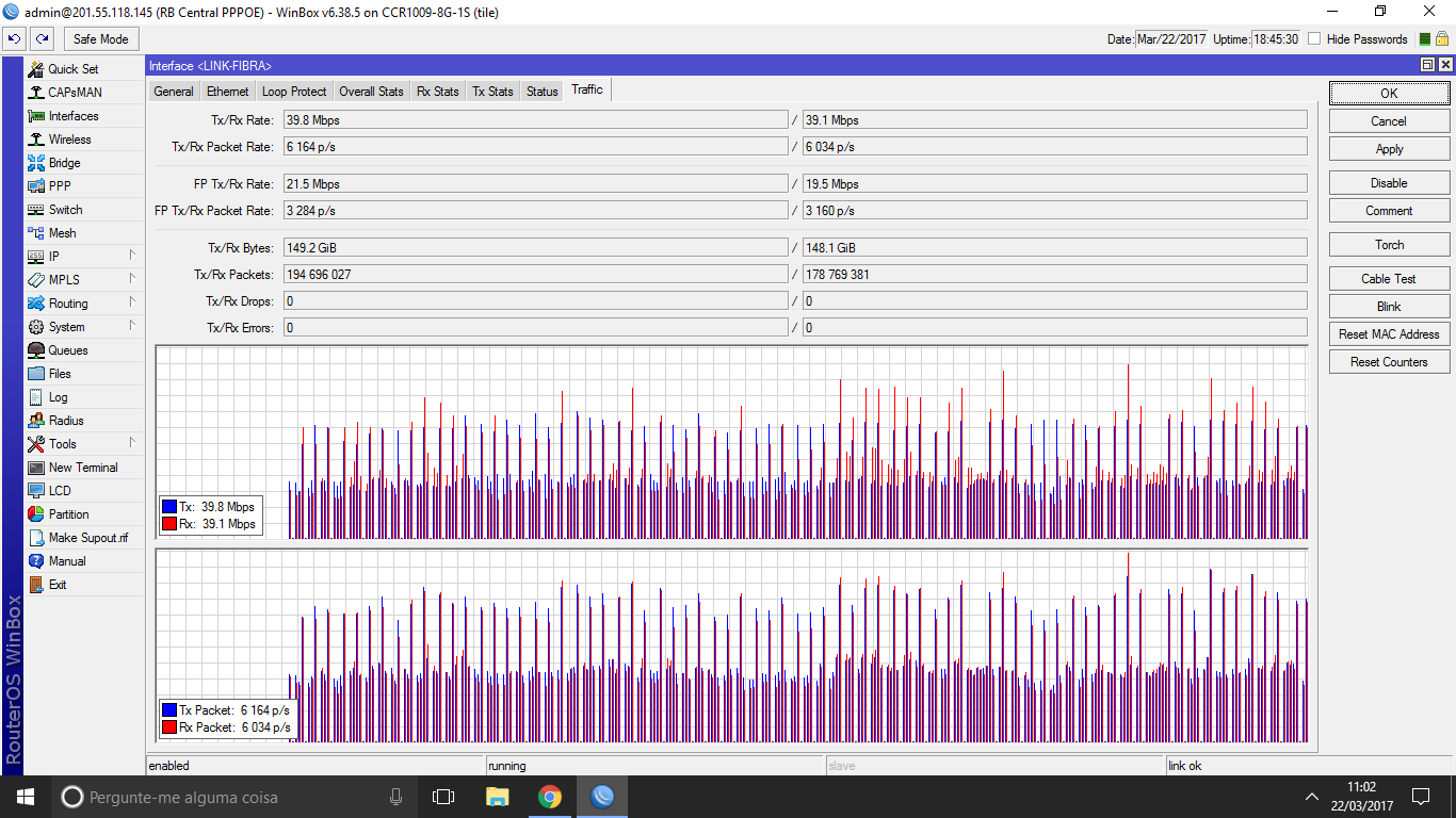 Fiz algumas sugestões que encontrei na web aqui, desativei o uso de criptografia no server pppoe e deixei apenas a opção chap marcada, TCP MSS com yes. Agora parou de travar, mas meu link dedicado fica pipocando, detalhe que tenho 35 megas, quando vai a 0 volta em +- 54 megas.Anexo 66482