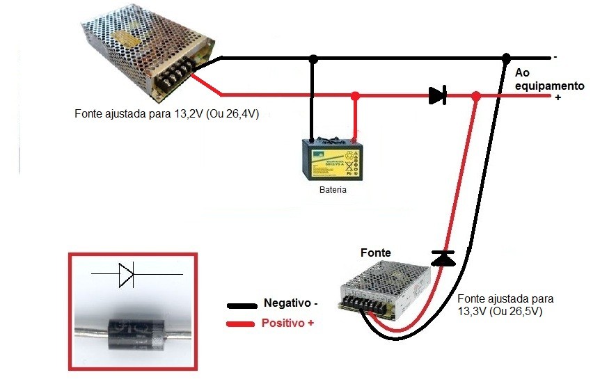 Nesse esquema o consumo sai da fonte com a maior tensão, por isso uma precisa ser ajustada pra uns 0,1V a mais que a outra. Se a fonte que tiver vai só até 26,2V, o jeito é ajustar a outra pra 26,1V, ou fazer isso, com 2 fonte de mesma tensão (Mas pelo menos 13,1V por bateria):