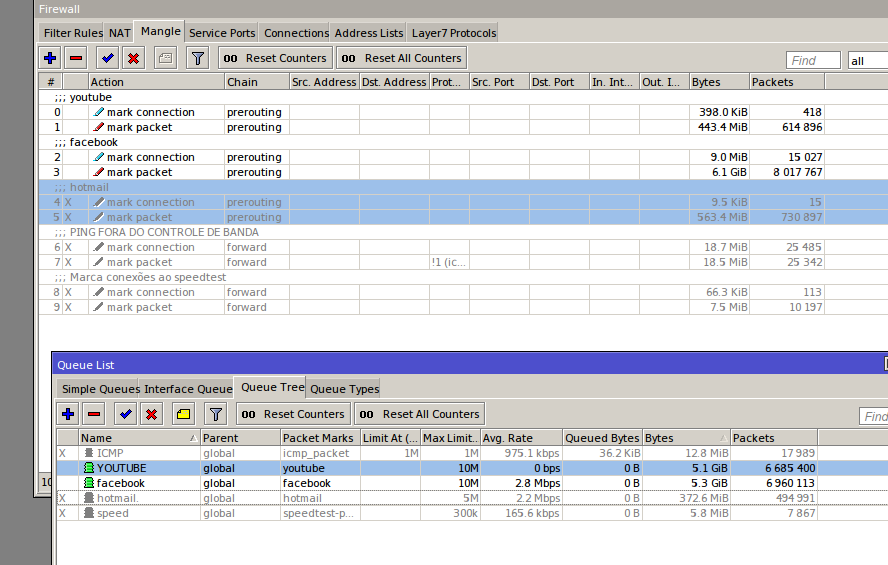 Alguém já viu isso, criei 2 regras no mangle para youtube e facebook, já as configurei no queue tree e mostra a contagem correta de pacotes porém quando habilito as duas regras ao mesmo tempo sempre uma pára e não funciona.