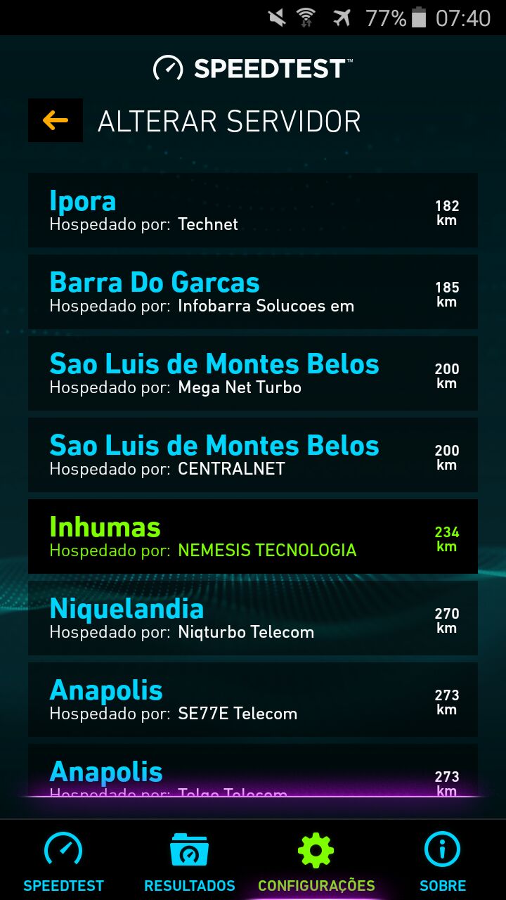 Anexo 66708entao pessoal..tenho um cliente que ele disse que gosta de jogar um game online..nao sei qual..minha internet tem o ping de 10ms..mais la no jogo dele o ping fica alto..e o servidor do jogo é aqui no Brasil..entao fazendo umas pesquisa aki eu vi que o problema é a distancia que o cliente esta do servidor..que como vcs podem ver na foto é de 234km...pois todo teste de velocidade que faço é sempre o servidor de Inhumas que é escolhido...entao eu queria saber se tem como escolher o servidor de Iporá por ele esta mais perto ou se tem como abaixar a distancia desses servidores..me ajudem aí por favor kk..É uma dúvida bem boba mais que esta me encucando rsrs