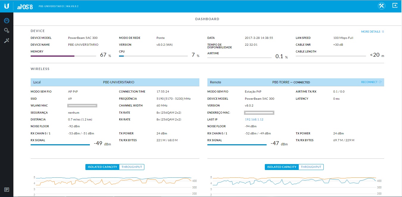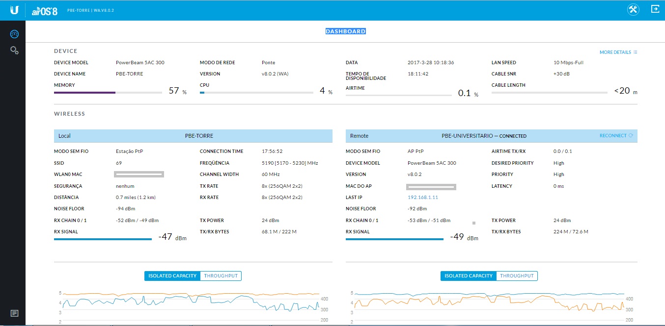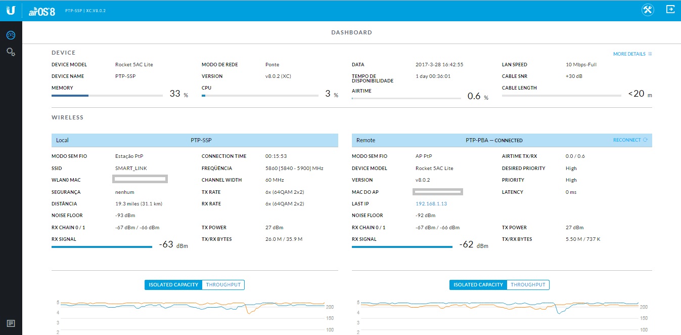 PTP com PowerBeam e Rocket AC Lite taxa de transferência entre 10 e 100