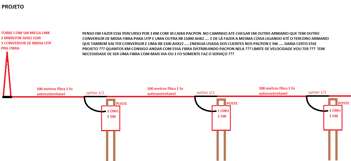 Ex: Se quer sair da torre para interligar os 3 armários na rua, precisa de um cabo óptico de 6 fibras ou 6 F.O, Sendo que em cada F.O você vai fechar o PTP com 1 "Conversor" Na torre e o outro no armário, sendo que do terceiro armário pra frente você só terá 3 F.Os livre no seu cabo óptico de 6 F.O.