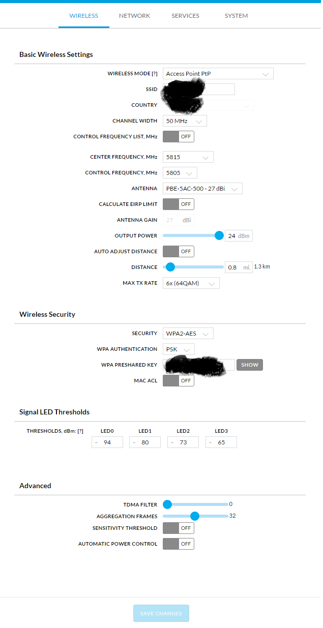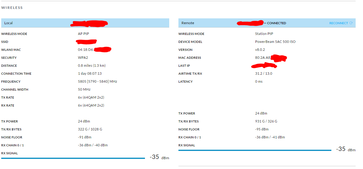 Tenta baixar um pouco a potência das 2 antenas, e fazer um alinhamento um pouco melhor pois ta dando uma diferença de 4 a 5 dbi entre os chains.