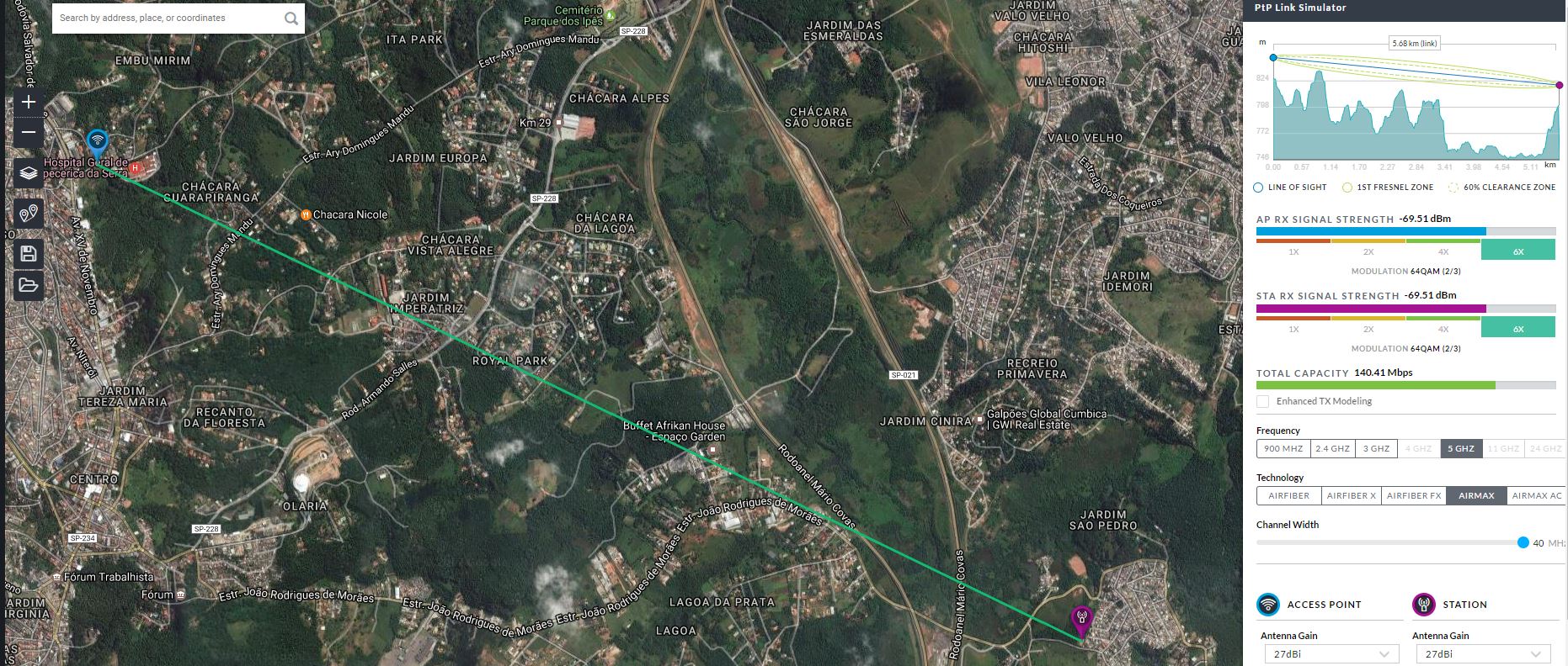 Boa tarde galera, estou iniciando agora no mundo de comunicação de antenas PTP, necessito de uma ajuda para selecionar o melhor kit para comunicar minha matriz com a filial, tendo em vista que terei alto trafego de dados neste tunel, gostaria de saber quais antenas me indicam para executar o mesmo irei adicionar imagem do projeto que utilizei no airling calculator.