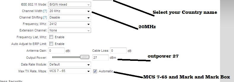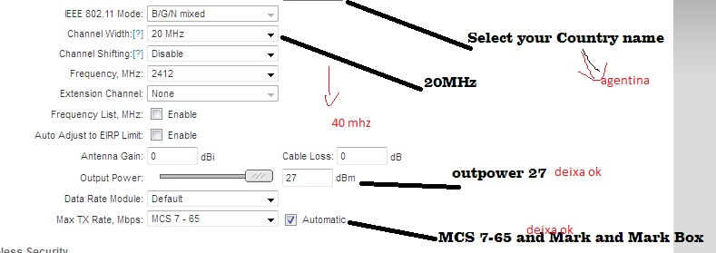 EM OutPut Power vc bota 20 dbm para iniciar os testes, e conforme for precisando de mais alcance vá aumentando até 23 dbm por ai, não aumente mais que isso pois vai causar muita interferência no seu próprio sinal.