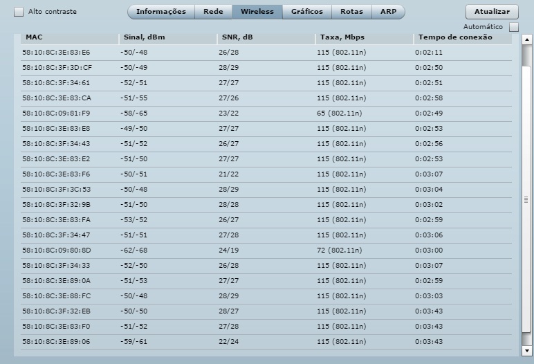 Nível de sinal média -52 nos clientes e também na base, todos fixado mcs9 e base mcs12.