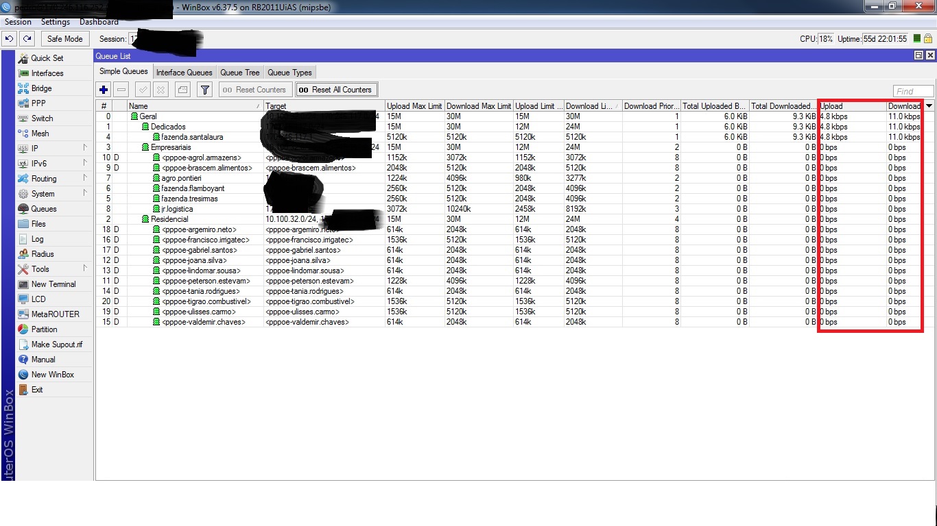 O valor das "parent queue" deveria ser a soma de todas as "child queue", pela teoria, mas na pratica não apliquei dessa forma pois como todos sabem, é impossível ter 100% dos usuários online e nesse caso eu só teria 5 clientes por AP.