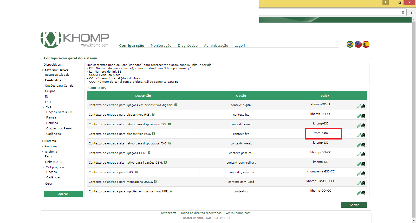 Então, acessei as configurações da placa Khomp (pelo endereço