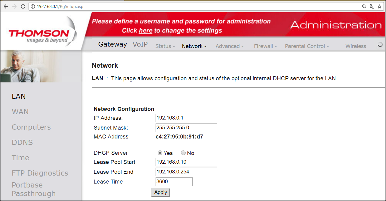 Pessoal estou com esse modem Thomson DWG874B estou tentando alterar o IP da LAN de 192.168.0.1 para 192.168.1.1, porém faço alteração e quando desligo e ligo o modem volta para o padrão 192.168.0.1.