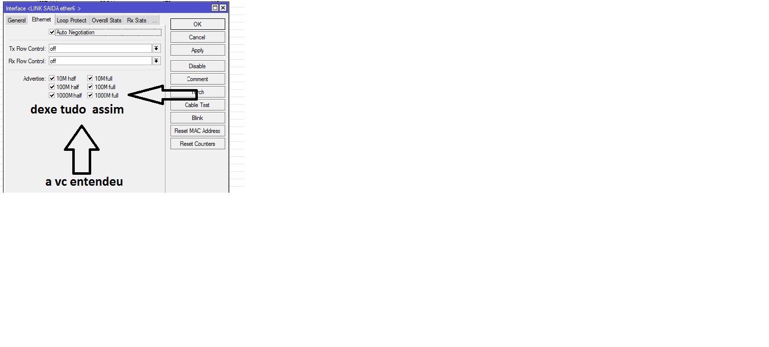 clica na interface... na aba eternet.. veja como esta as velocidades de conecçao... se todas estiverem normais... repare se na interface que sai e chega o link esta com limite de velocidade em 10 megas...Anexo 67481