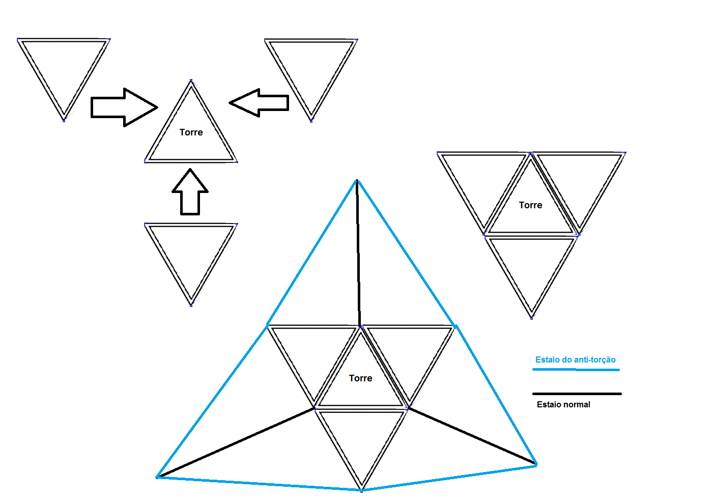 Penso em fazer ele com as barras de contraventamento (1/2"), paralelos ao solo, na altura do estaiamento medial (20m) - serão 03 estaiamentos 10, 20 e 30m. Nele posso usar 01 cabo de aço em cada lado da barra, descendo em direção à mesma base de estaiamento.