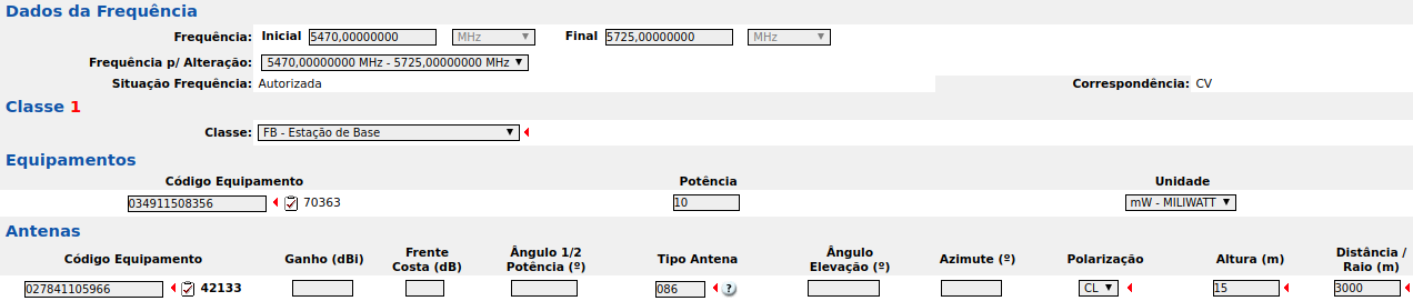 Devo dizer que achei muito estranho esse sistema da Anatel, totalmente sem sentido, por permitir cadastrar apenas 1 conjunto rádio + antena em um espaço de 255MHz de espectro e outro de 125MHz. Ah, sem falar que na lista de rádios aparecem equipamentos com antena integrada, mas se você escolhê-los, ainda tem que informar uma antena no cadastro da frequência, sendo que a antena integrada não aparece na lista, obviamente, e tentar enviar com esse campo vazio resulta em erro.