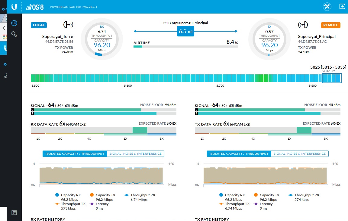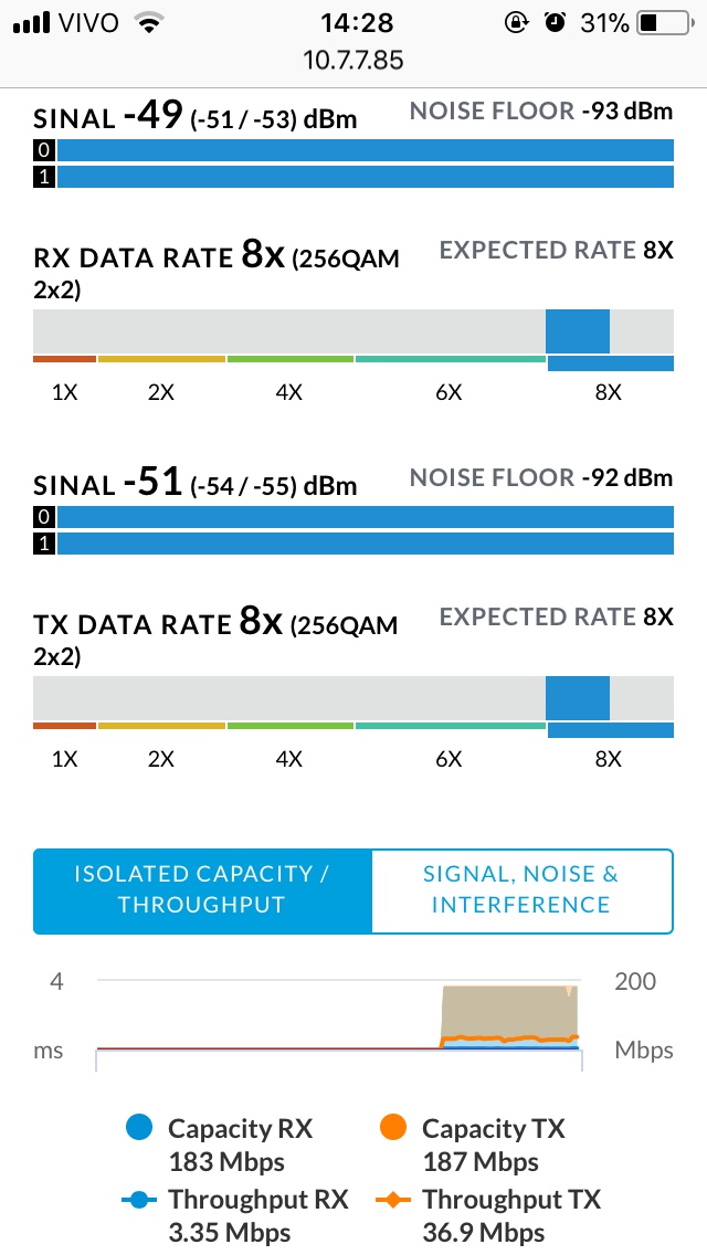 Bom dia, estou compartilhando um link meu de 11 km sobre o mar, onde o link está passando 95 megas de envio e 85 de recebimento, testes realizados no speed test do próprio powerbean e no bandwidth test da miktrotik. Equipamento powerbean 5ac 400.