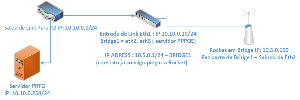 Minha duvida é como posso acessar do Servidor PRTG ( ip 10.10.0.254) a Rocket (do ip : 10.5.0.100) lembrando que da rb para rocket eu consigo pingar nela ao adicionar no ip adress o range de ip da rocket na bridge1 onde a interface dela faz parte.