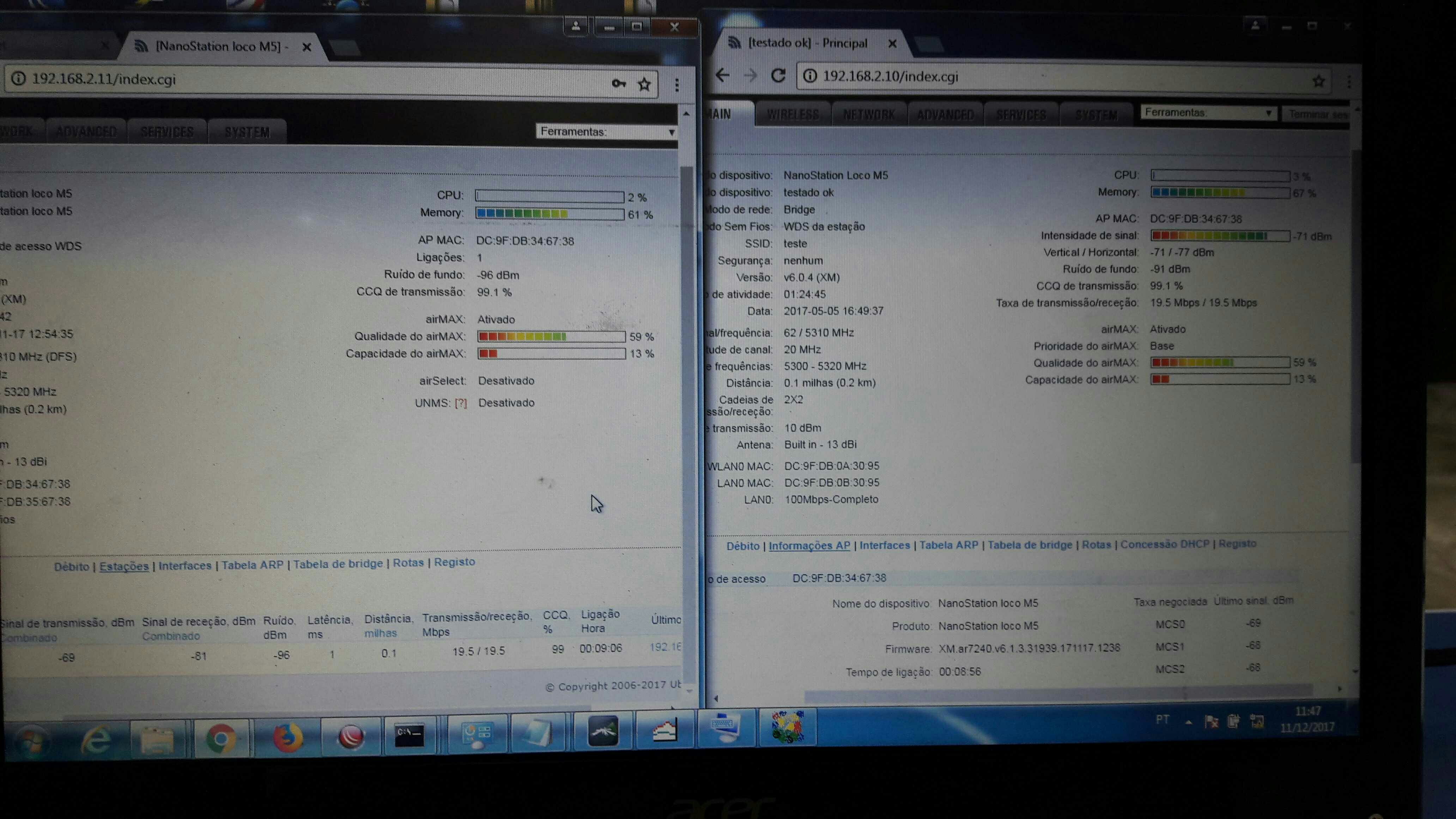 Amigo manda um print ai da aba main e wireless. Já tive muito problema com isso e 90% nao era o radio com problema. Era interferencia, troca de canal ajuda Airmax baixo. Agora a respeito dos canal na aba wireless em Channel Width, como vc deixou o nano em: auto 20/40 que serve para 20 e 40 mhz; em 20 que só funciona em 20; ou em 40 que só funciona em 40 ? conferi o canal do ap se nao esta em 30 ou em 5 !Anexo 67968