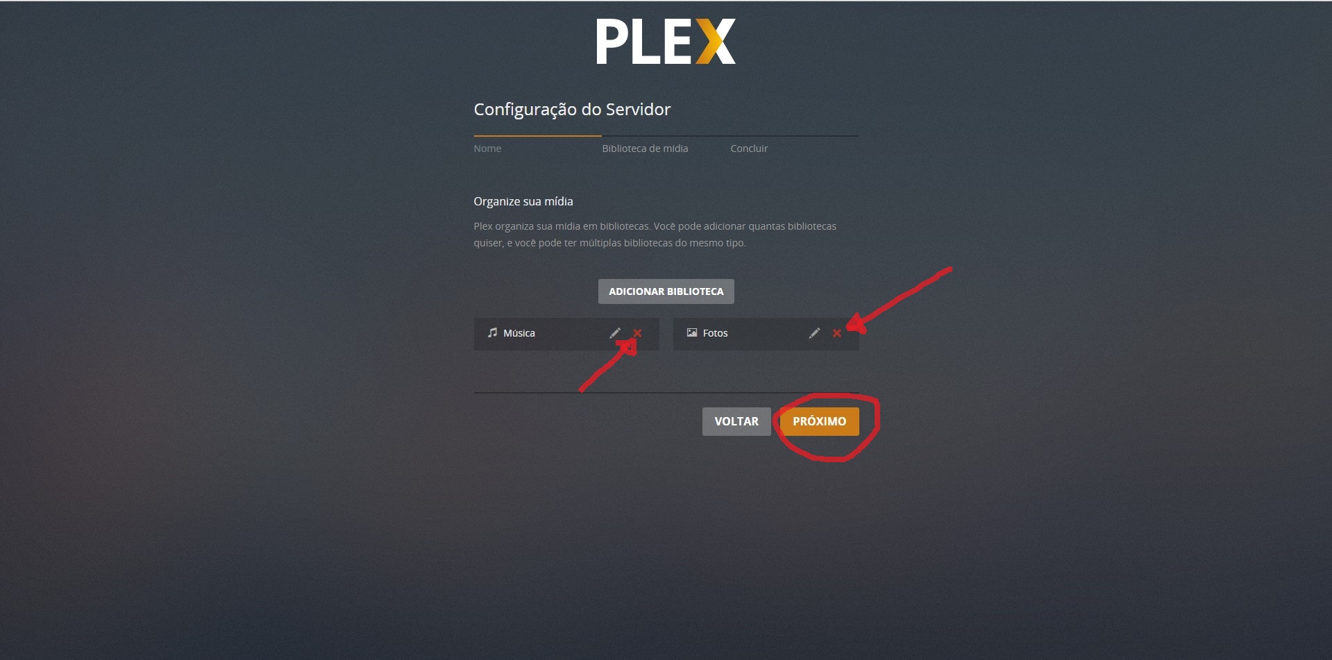 6- No seguinte delete as duos dois genero Musicas e Fotos apete X para fecha e clique próximo conforme a imagens.