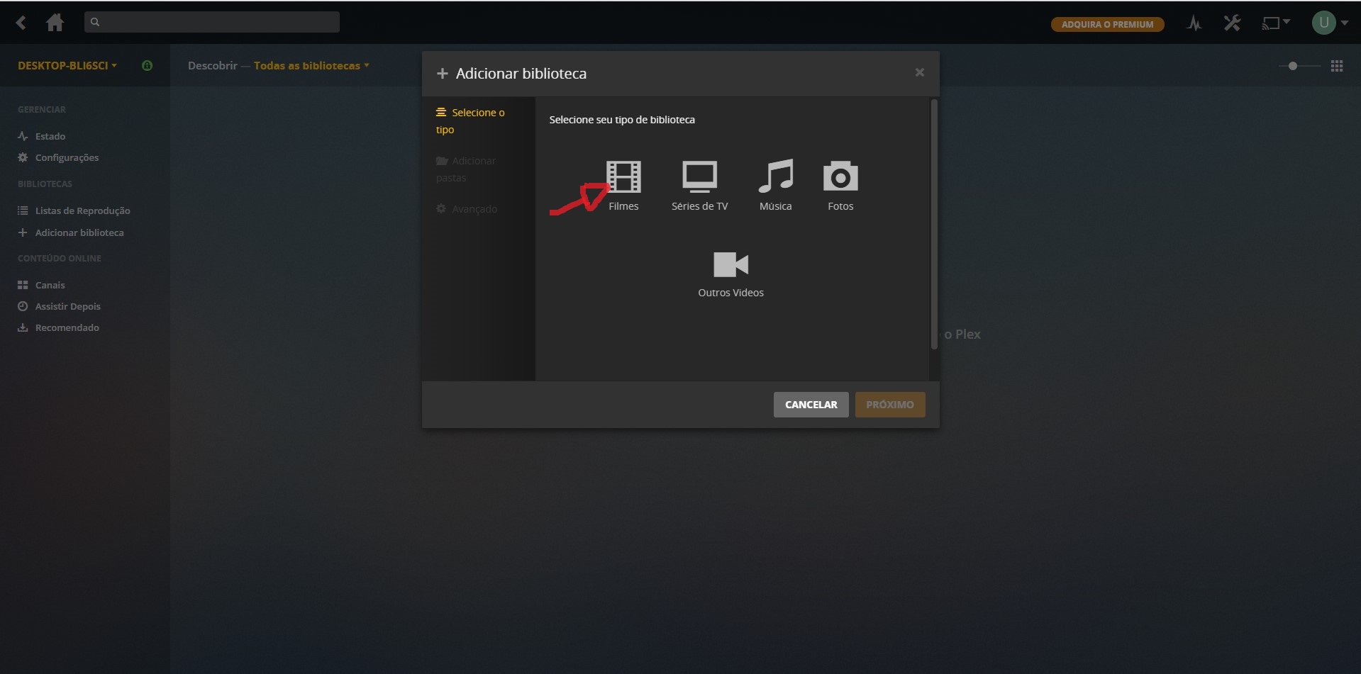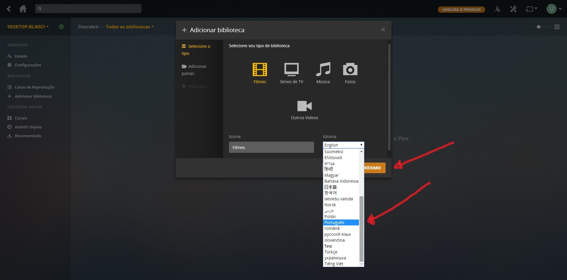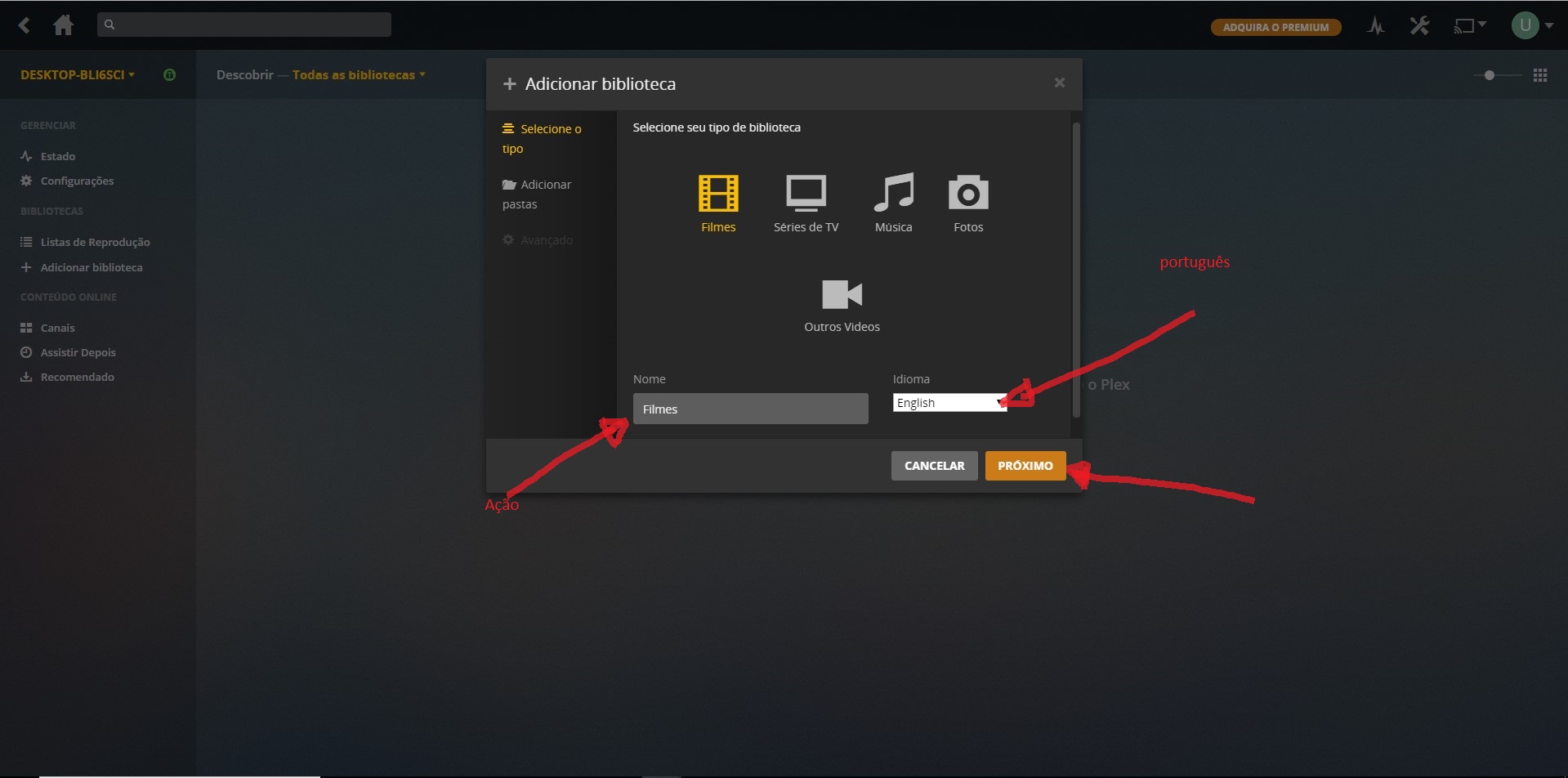 clique em adicionar Biblioteca escolha si for colocar filmes escolha filmes e de um gênero e muda a linguagem para português