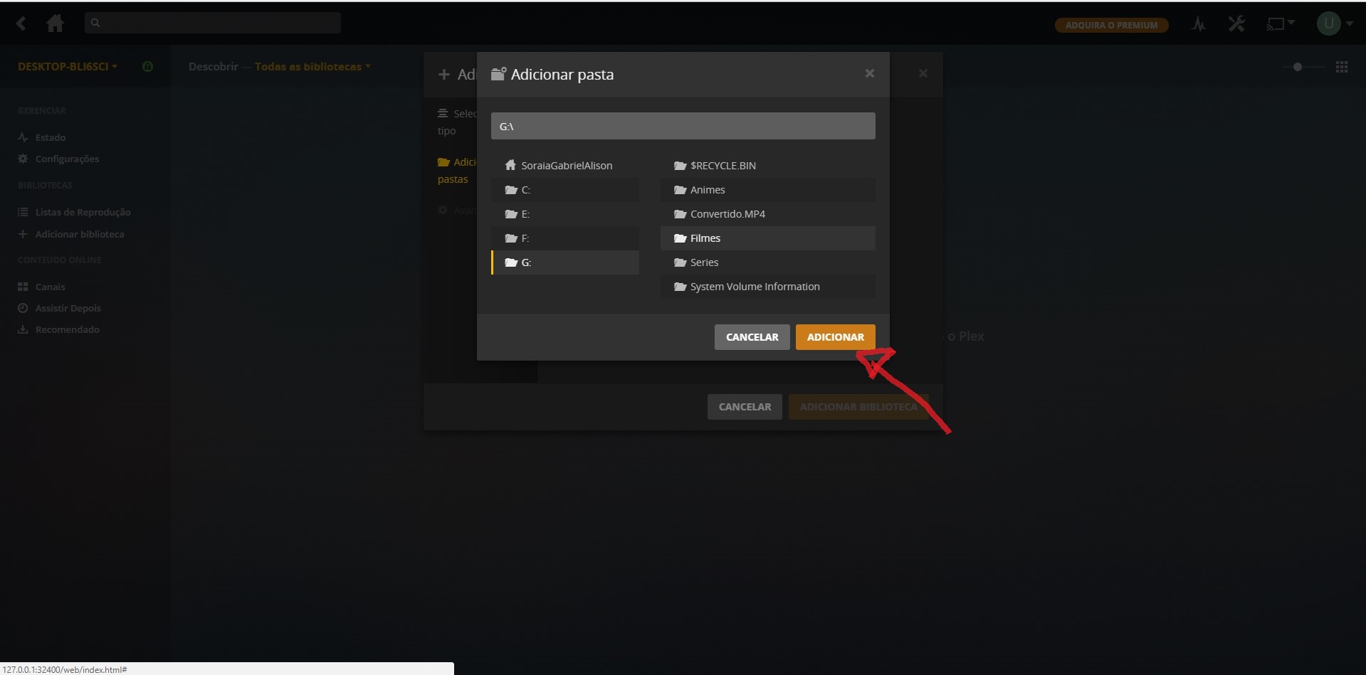 9-Agora vamos localizar onde esta os filmes selecione o local onde esta seus filmes e de um clique na pasta e e depois clique adicionar conforme a imagem abaixo.