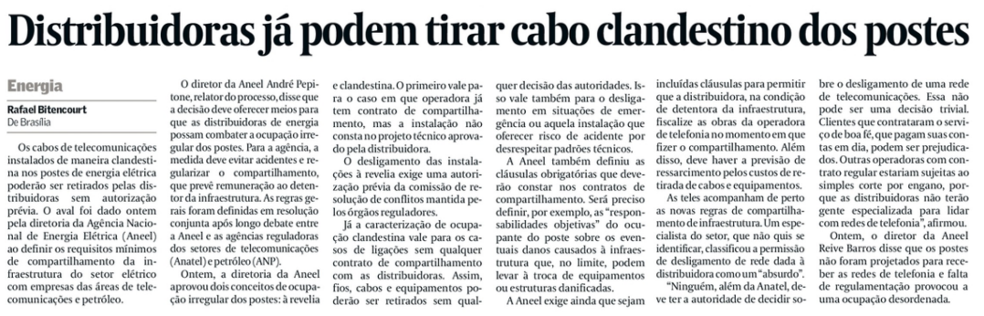 Re: Distribuidoras já podem tirar cabo clandestino dos postes ( Materia do site Valor Economico)