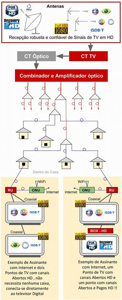 Usamos a capitação do sinal de TV por ISTB-T ou parabólicas e colocamos os equipamento de Transmissão ópitica e amplificação,e levamos até o cliente sem consumir a banda da Internet.