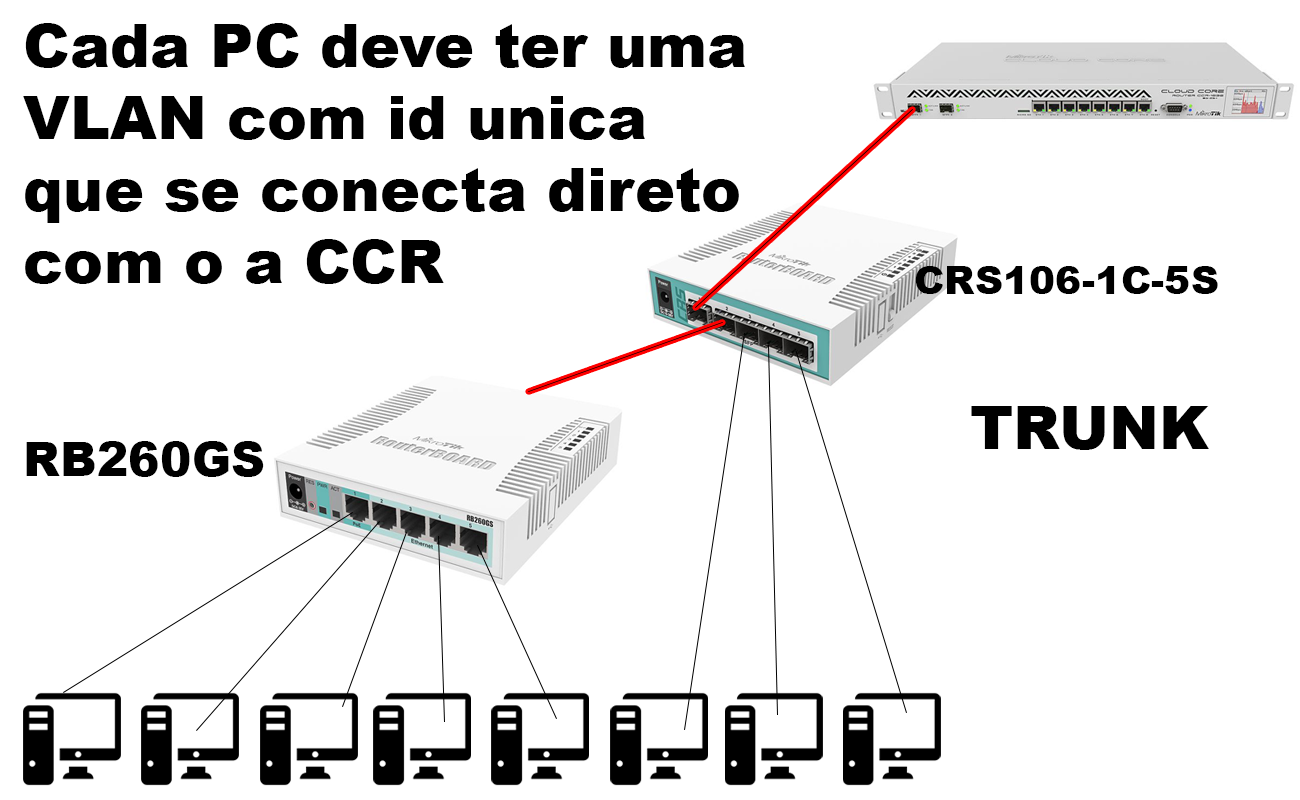 Meu cenário é o seguinte, tenho uma CCR fazendo enlace ponto a ponto SFP com um swich SFP um CRS106 tbm da mikrotik, configurado com Trunk, cada porta do swich é uma vlan que conversa com a CCR, até ai tudo certo, ta funcionando perfeitamente, dai surgiu a necessidade de por um um swich depois do primeiro swich, ficando assim CCR > SWICH 1 > SWICH2 o swich 2 precisa conversar com a CCR com uma VLAN em cada porta tbm ou seja um segundo Tunk dentro do outro, é ai que ta o problema o primeiro swich 1 não deixa passar as vlan pro segundo swich, ja tentei habilitar o tag de ambas as extremidades porem o primeiro swich não deixar a segunda RB enlaçar com a CCR