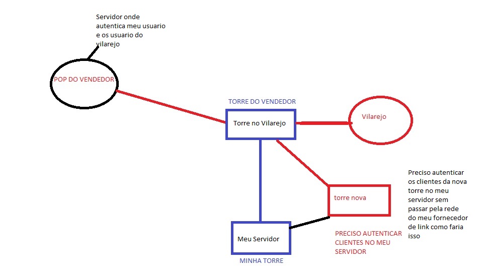 Certo mas o problema que eles vai autenticar no servidor da empresa que me vende o link é não no meu! Pois meu servidor vai ficar na frente! Tipo minhas torre tem um servidor com o usuário que ele me liberou! Como que vai autenticar os usuário dessa torre sendo que o a porta querecebe o link está discando no servidor dele!