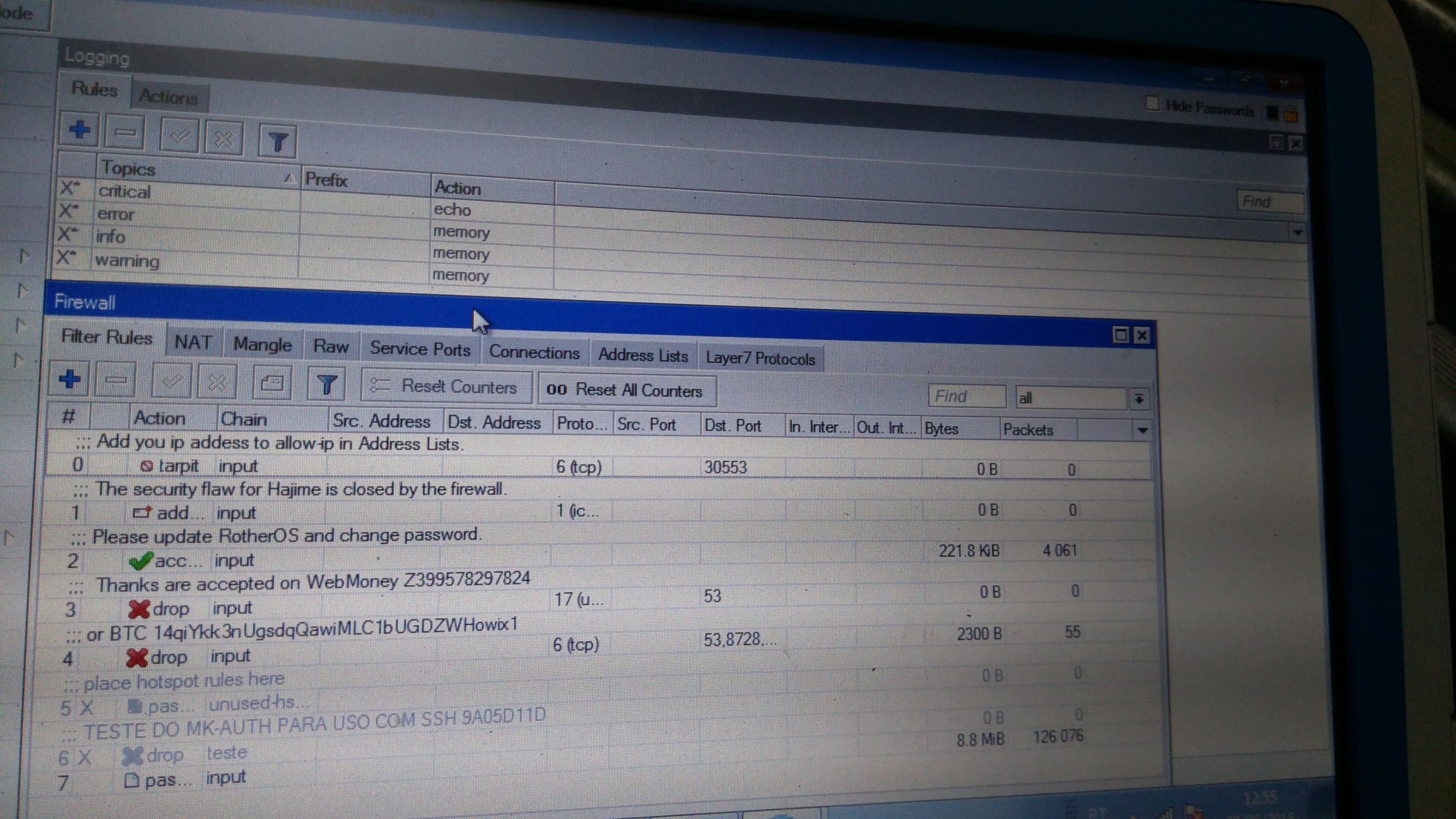 A pessoa que entrou, faz uma proteção em firewall para voce nao possa ser mais invadida e manda voce atualizar para a versao mais nova do mikrotik.