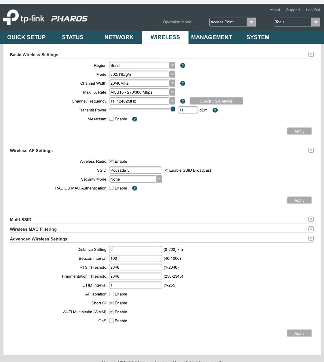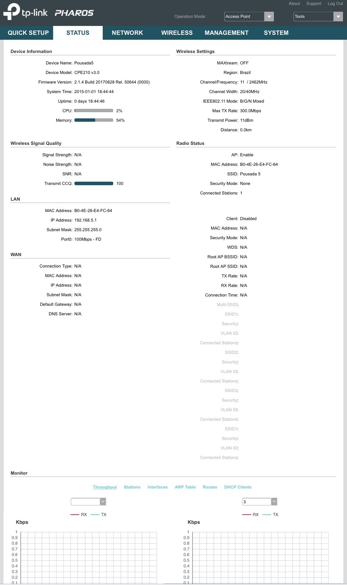 Screens de um dos APs (tive que desligar o Mikrotik para poder ter acesso ao Access Point via Wireless e poder acessar o menu dele)