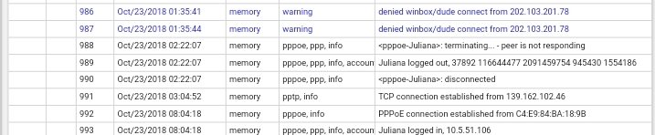 Bom dia, então, já coloquei regras no firewall para identificar escaneamento de portas bloqueando esse ips, desativei serviços na ip>serviços, troquei a porta de acesso via www, cetei ip local para a estão via winbox, não tenho vpn, tenho dúvidas em firewall>serviços ports! Desativei ftp e pptp...... Anexo 69047