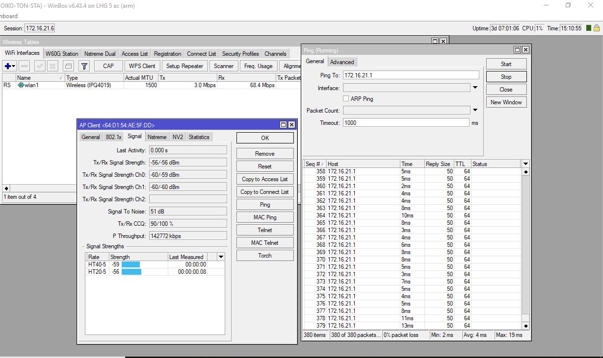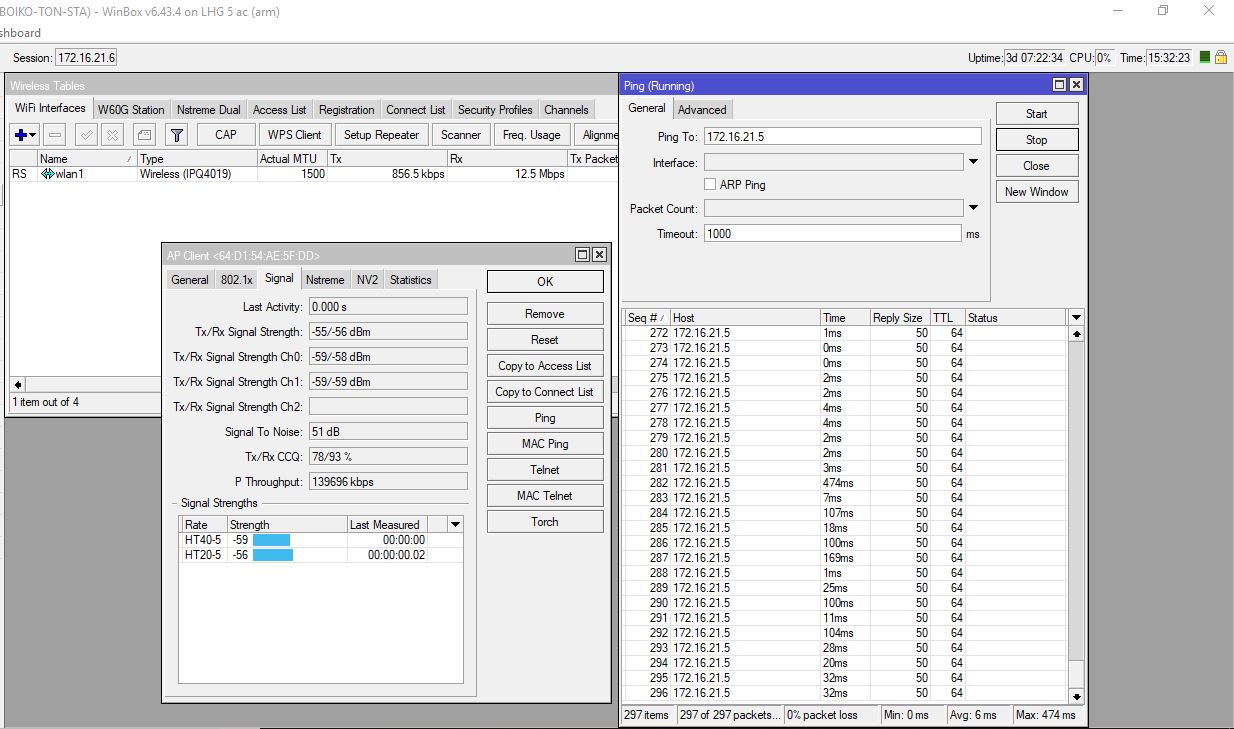 Testa fixar em MCS12, porque o sinal real é -60dBm (Nivele pelo mínimo, pelo menor), e isso não é sinal suficiente pra CCQ perfeito em MCS13 (Em 64QAM a sensibilidade está nuns -75dBm, tem só 15dBm de margem entre sinal e sensibilidade, precisa margem acima de uns 20dBm pra ter PTP estável e com ping baixo).