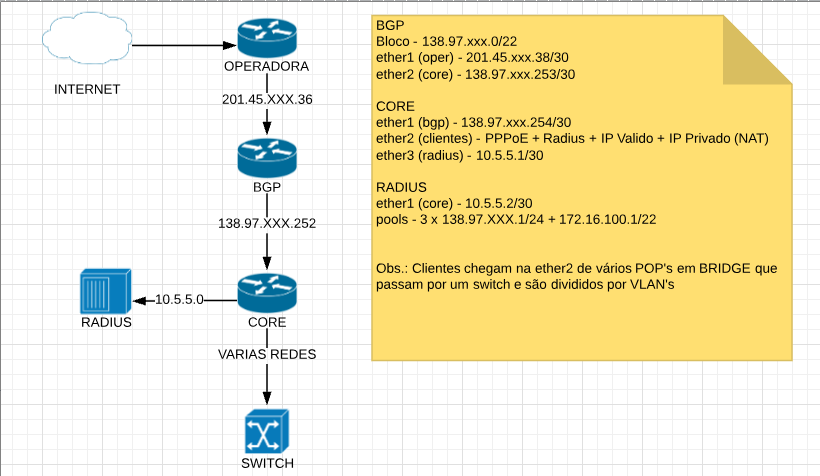 Quero também futuramente rotear o restante da rede e direcionar as autenticações para os POP's mas queria ja deixar organizado o núcleo!