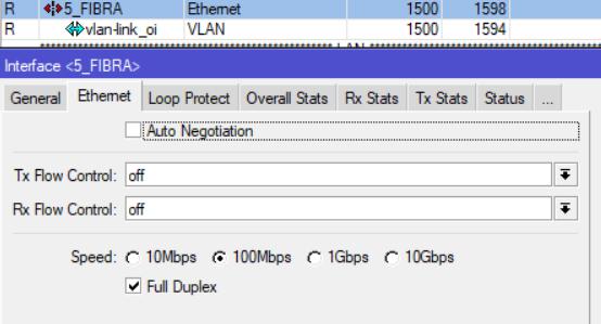 Tenho um link dedicado da oi que chega através de uma fibra e sai pelo esse DATACOM e chega em meu Mikrotik e uso o link dedicado, porém estou com problema de colisão dentro do Mikrotik, alguns amigos dizem que eu tenho que setar 100mb na porta de entrada e na porta de saída do Mikrotik, porém quando eu seto no Mikrotik 100mb, o link cai e nao funciona, ai eu tenho que marcar novamente auto-negotiation para voltar ao normal.